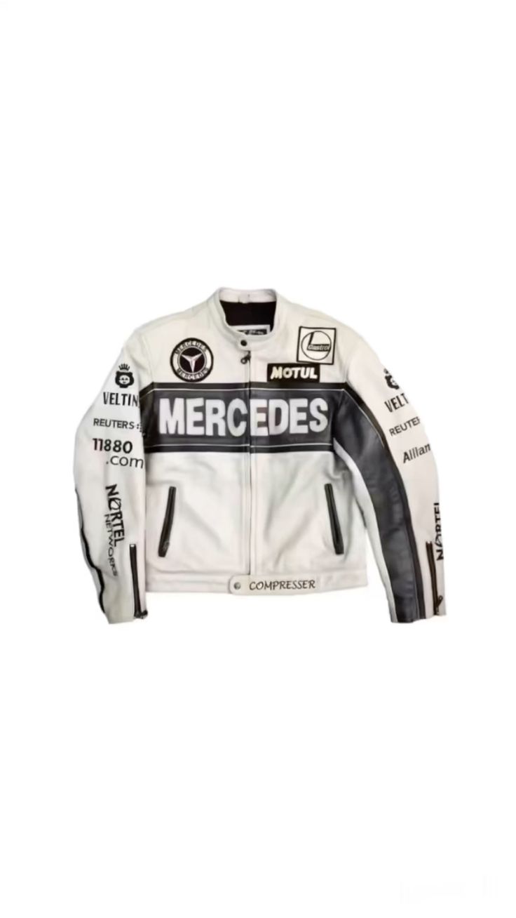 Step into the world of motorsport style with this Mercedes White Racing Leather Jacket. Designed with premium quality leather and detailed racing graphics, this jacket embodies speed, luxury, and performance. Its bold "MERCEDES" branding and sponsor logos make it a perfect pick for car enthusiasts and fashion-forward individuals who love sporty aesthetics. Whether for casual wear or collector’s style, this jacket delivers both comfort and standout appeal.